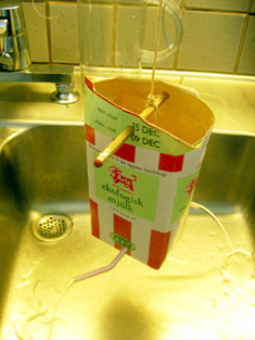 hjälp av ett mjölkpaket, ett par sugrör med "knäled" och lite