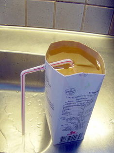 Klipp av toppen på mjölkpaket och gör ett hål för sugröret en